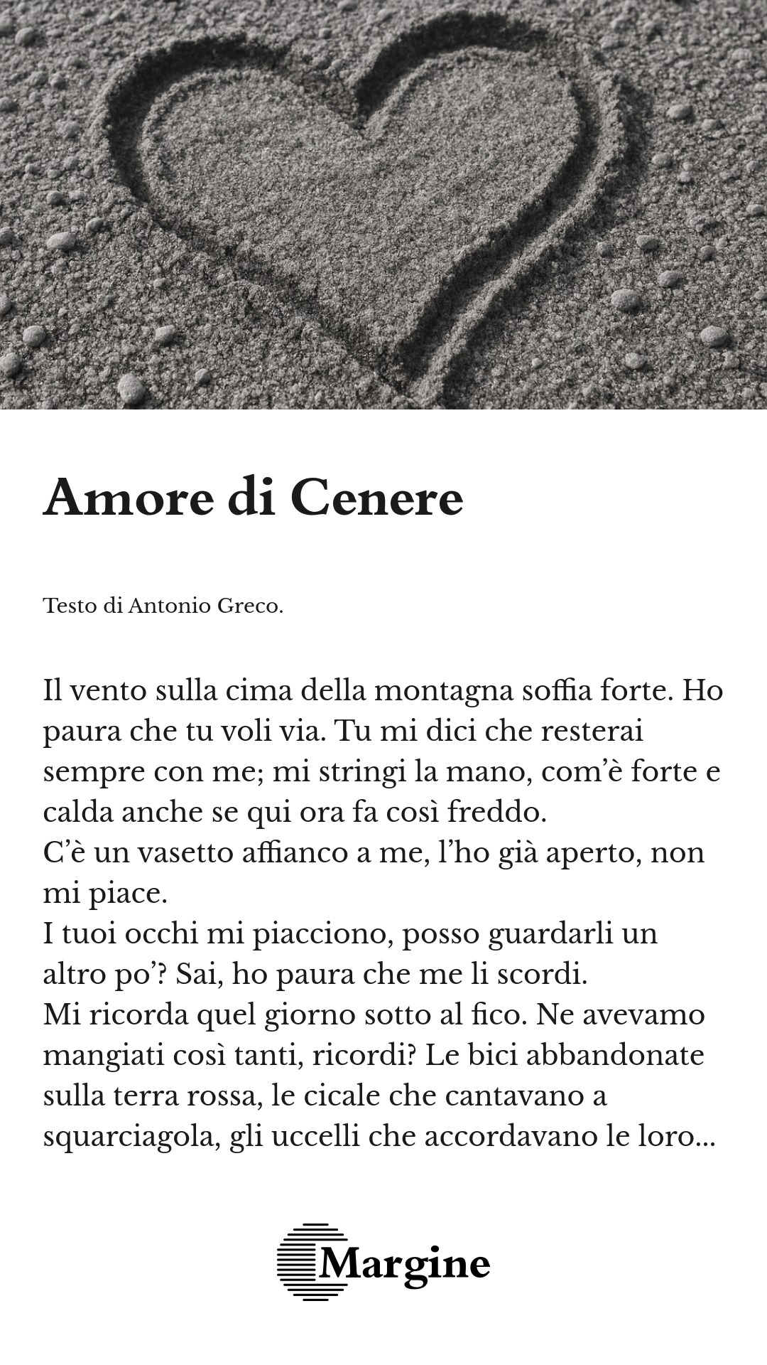 Ti lascio andare. Perché nemmeno la cenere esiste. Esiste solo l’amore alla deriva, che guarda me e la cenere allontanarci; scendiamo dalla montagna in silenzio.