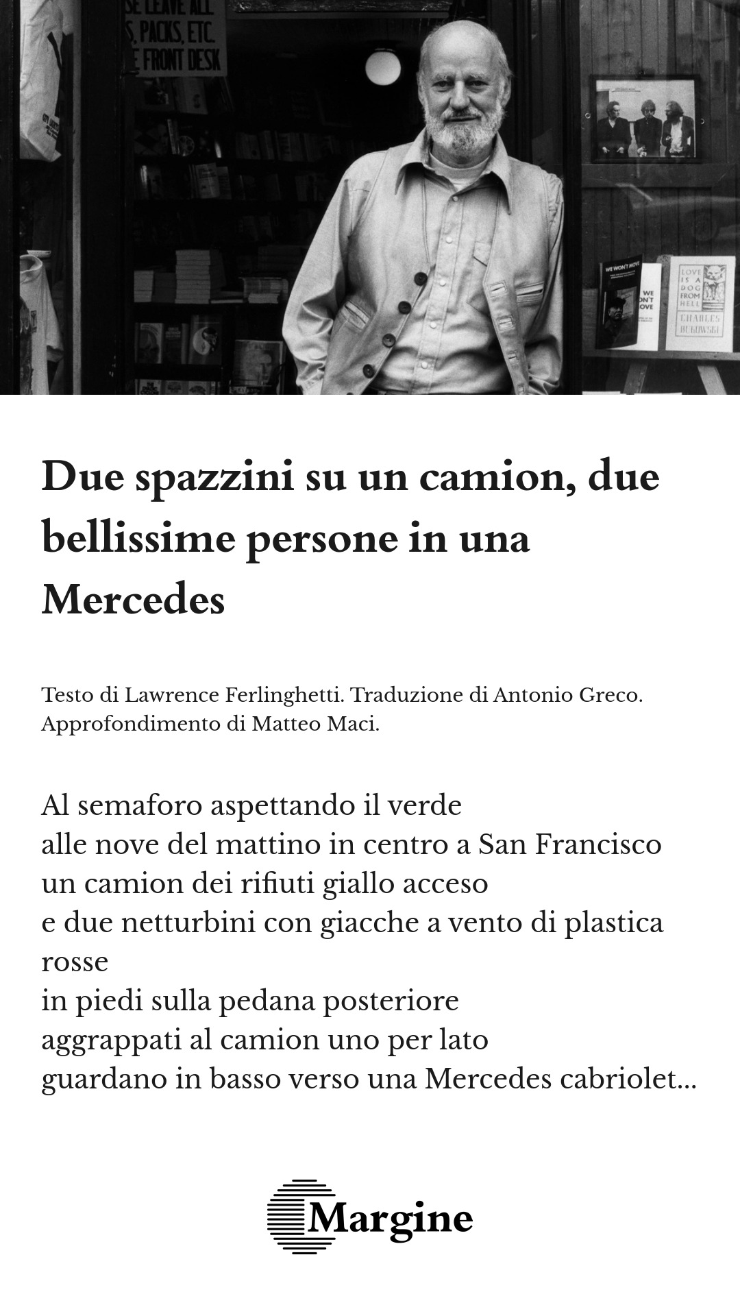 Nel 1968 Ferlinghetti scrisse Due spazzini su un camion, due bellissime persone in una Mercedes, che vi proponiamo in una traduzione curata da Antonio Greco.