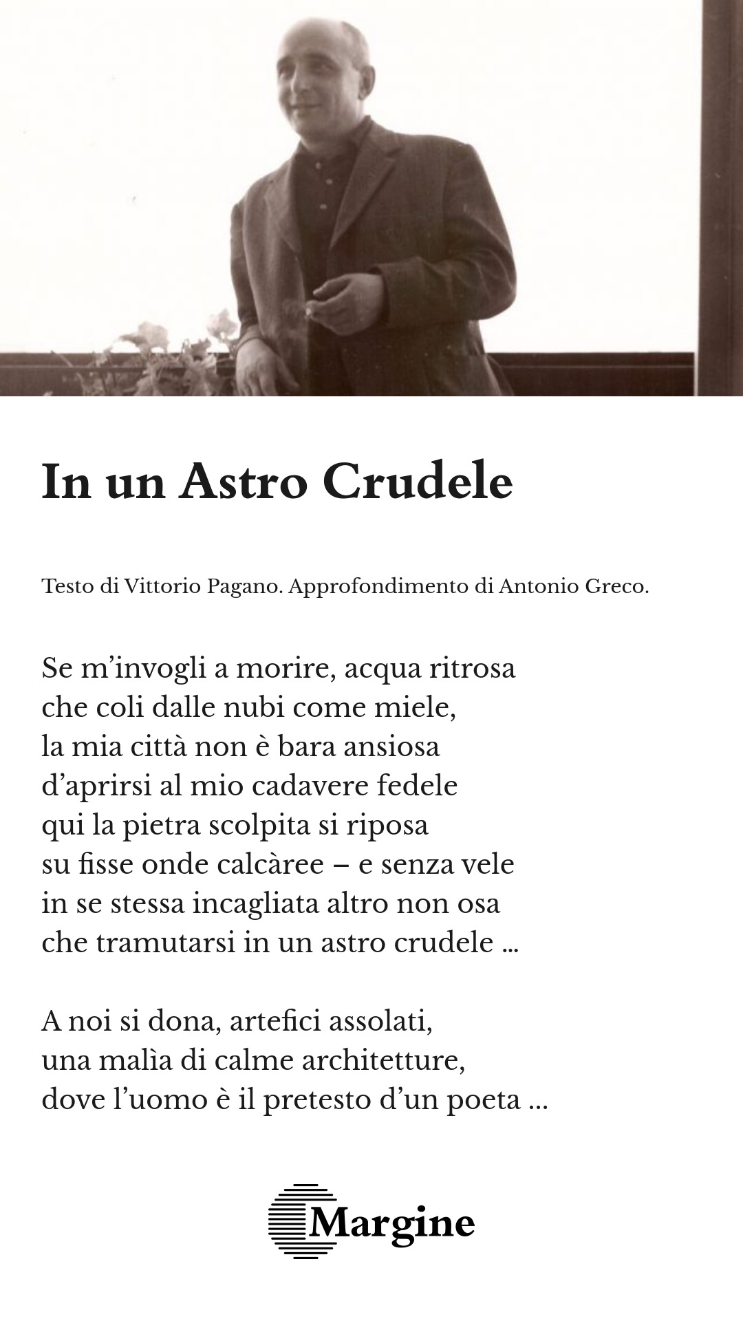 In questo sonetto emerge con dolorosa liricità il rapporto tra Pagano e la sua Lecce, immobile, calcarea, arenata: nei primi versi Pagano pare opporsi alla sua stessa percezione della sua città come bara pronta a fagocitarlo, ma ben presto il poeta riconosce come la pietra (leccese) riposi silente e immobile (senza vele) mentre la città stessa pare incagliarsi in sé, tramutandosi nell’astro crudele attorno al quale ruota non solo la vita del poeta, ma di tutti gli “assolati artefici”, ovvero gli altri poeti o forse i cittadini.