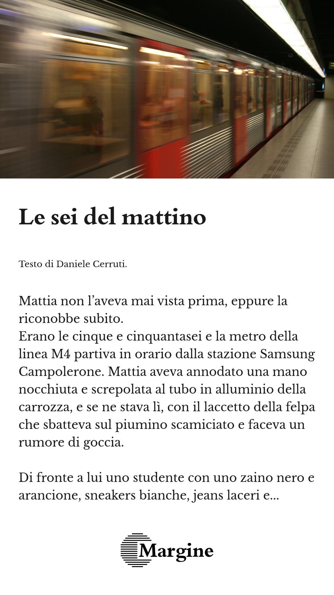 Erano le cinque e cinquantasei e la metro della linea M4 partiva in orario dalla stazione Samsung Campolerone. Mattia aveva annodato una mano nocchiuta e screpolata al tubo in alluminio della carrozza, e se ne stava lì, con il laccetto della felpa che sbatteva sul piumino scamiciato e faceva un rumore di goccia.