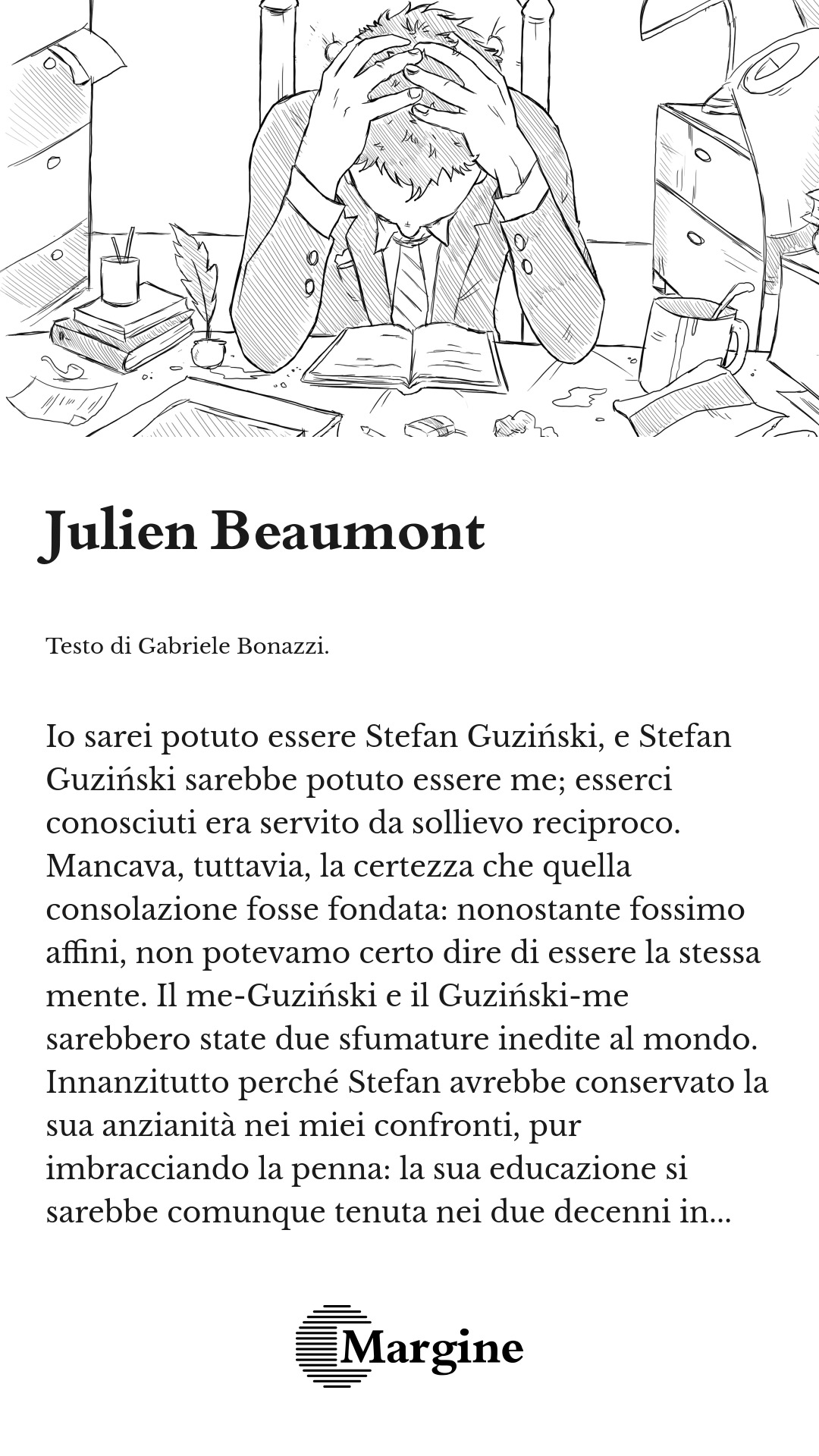 Julien Beaumont sarebbe potuto essere me. Julien Beaumont sarebbe potuto essere Stefan Guziński. Io sarei potuto essere Stefan Guziński, lui sarebbe potuto essere me; entrambi saremmo potuti essere Julien Beaumont; entrambi lo eravamo stati, per un periodo. Entrambi continuavamo ad esserlo, in segreto, combattendo perché non si impossessasse di noi.
