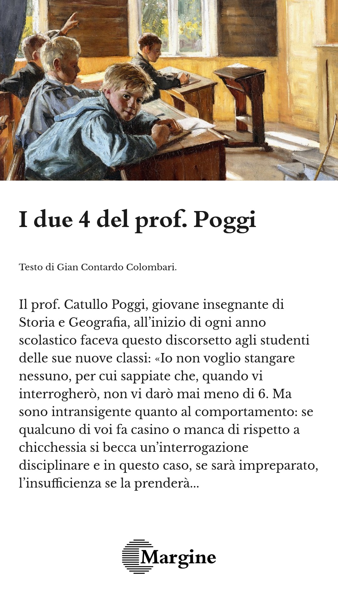 Il prof. Catullo Poggi, giovane insegnante di Storia e Geografia, all’inizio di ogni anno scolastico faceva questo discorsetto agli studenti delle sue nuove classi: «Io non voglio stangare nessuno, per cui sappiate che, quando vi interrogherò, non vi darò mai meno di 6. Ma sono intransigente quanto al comportamento: se qualcuno di voi fa casino o manca di rispetto a chicchessia si becca un’interrogazione disciplinare e in questo caso, se sarà impreparato, l’insufficienza se la prenderà eccome.»