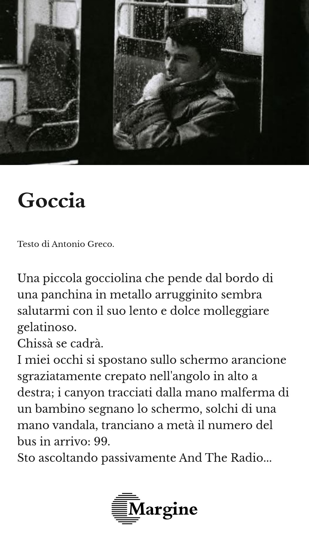 Poi ha cominciato a piovere, quante goccioline sul vetro che correvano, come delle biglie su una spiaggia di vetro, senza crepe, non come lo schermo della stazione.
