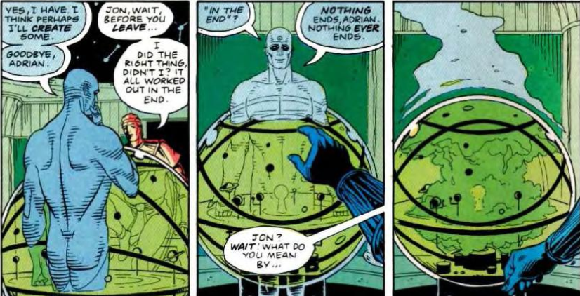 Alla fine della storia, dopo la vittoria di Adrian Veidt, Manhattan decide di andare in un nuovo universo, dove tenterà di creare la vita, divenendo il dio di quell’universo, avendo forse trovato nella creazione stessa la risposta alla domanda “chi fa il mondo?”.