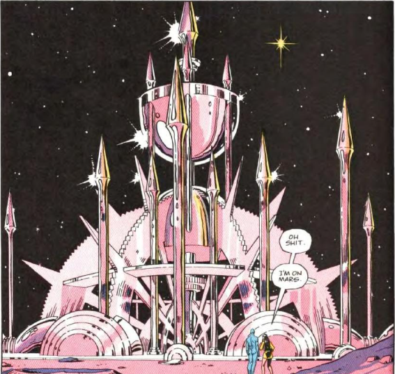 Su Marte, il superuomo insiste sulla comparazione dei grandi successi dell’umanità con le vette e le valli di Marte, sminuendo l’importanza della vita umana, e soprattutto del suo legame con la Terra, ora che Laurie e lui si sono lasciati e il suo ultimo legame con l’umanità si era così spezzato. Mentre Laurie insiste nel vedere le cose nella sua prospettiva limitata, criticando Manhattan per agire come se fosse un burattino mosso solo da eventi che prevede, e che in teoria potrebbe modificare.