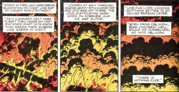 La visione del mondo di Rorschach, per quanto oscura e cinica come quella del Comico, è molto più orientata all’azione che non alla passività. Il nichilismo esistenziale di Edward Blake è un esercizio sterile e fine a sé stesso, mentre quello di Rorschach è rigido è inflessibile, bianco o nero. Verità a tutti i costi, niente compromessi, anche di fronte alla catastrofe.