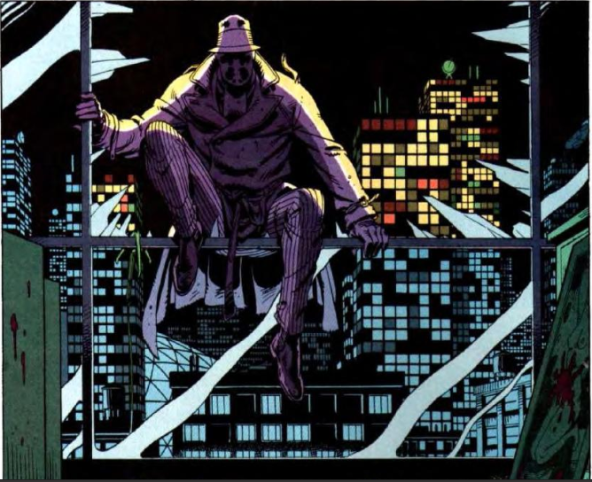 Nonostante il movente non sia ancora chiaro, un collega di Fine specula che si potesse trattare di una banda criminale nota come “I nodi”, ma Fine non prende sul serio questa pista, e consiglia di mantenere un basso profilo per non attirare l’attenzione dei “vigilanti mascherati”: infatti, nonostante la messa al bando di tutti i vigilanti non governativi, nella città di New York è rimasto attivo un solo vigilante governativo, noto come Rorschach. Temuto, spietato e violento, Rorschach ha spesso interferito con le operazioni della polizia, catturando e giustiziando criminali e sospettati; per il detective Fine l’intervento di Rorschach significherebbe ritrovarsi con una montagna di omicidi da gestire.